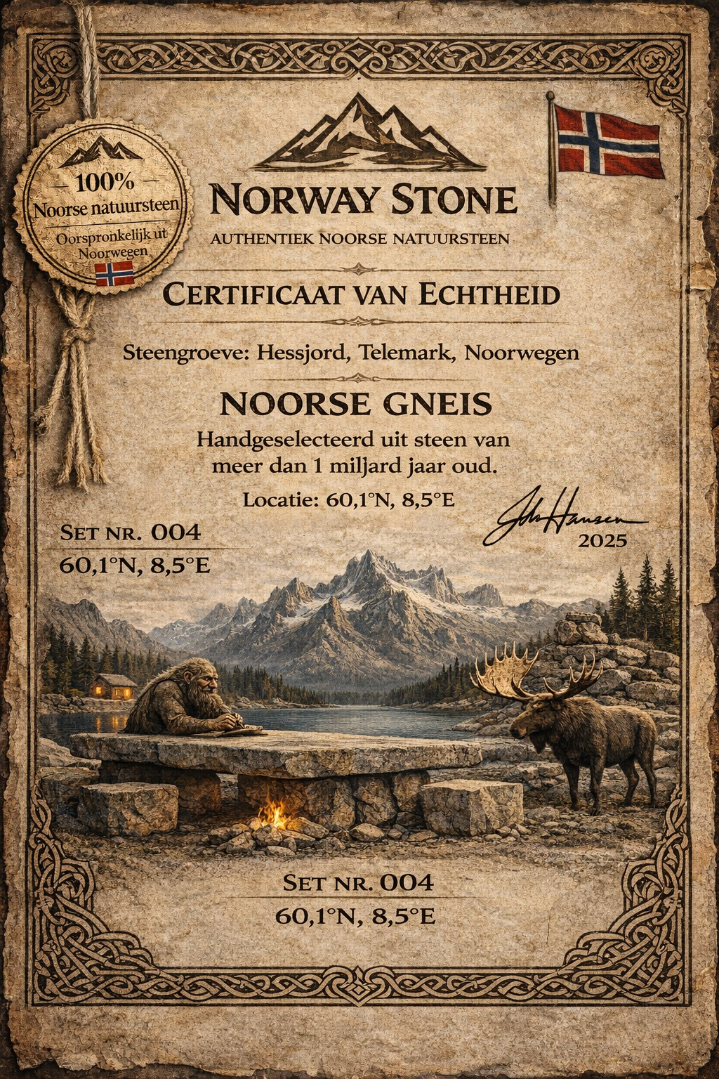 Dit certificaat legt de herkomst vast : het type natuursteen,de oorsprong in Noorwegen, de coördinaten en het jaar van samenstelling.